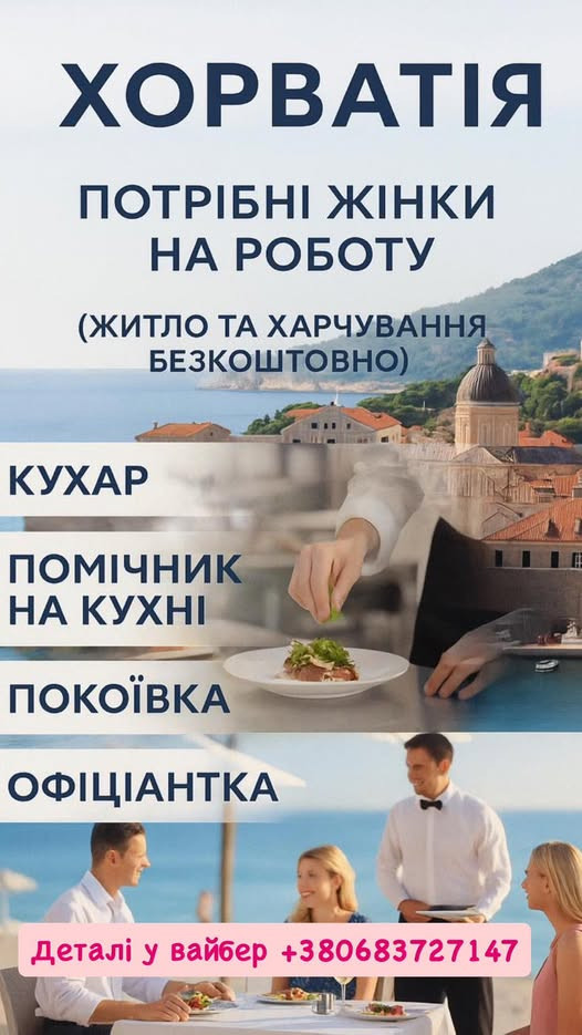 Croatia Хорватія - потрібні жінкі на роботу admin Admin +380683727147 HR Croatia Кухар Хорватія покоївка HoReCa ugostiteljstvo Hospitality Sezonski posao Hrvatska Офіціантка Помічник на кухні admin Follow Contacnt for advertising https://t.me/+380736615789 Telegram https://wa.me/380736615789 WhatsApp You may also like Потрібна офіціантка / адміністраторка ☕️ У кафе в місті Lučko 0 0 0 U Luxury hotelu Riva u Malinskoj na otoku Krku tražimo pomoćnog radnika u kuhinji od sada pa do kraja 10 mjeseca 0 0 0 Hotel Vila Wolff Dubrovnik traži sljedeće pozicije: bartender, perač za suđa 0 0 0 Tražimo pojačanje u Banana Baru! 0 0 0 Вакансія: працівник пральні - без досвіду (для чоловіків та жінок) Локація: Задар або Дубровник 0 0 0 Zapošljavamo sobarice i čistačice (m/ž) za hotel s 4★ na Makarskoj rivijeri 0 0 0 Facebook Conversations