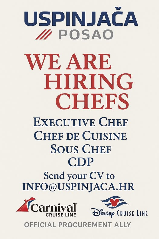 Mi smo službeni regrutacijski partner za Carnival Cruise Line i Disney Cruise Line. Trenutno tražimo iskusne kandidate za kuharske pozicije: