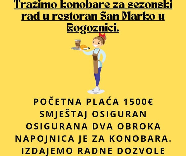 Tražimo konobare za sezonski rad u restoran San Marko u Rogoznici.