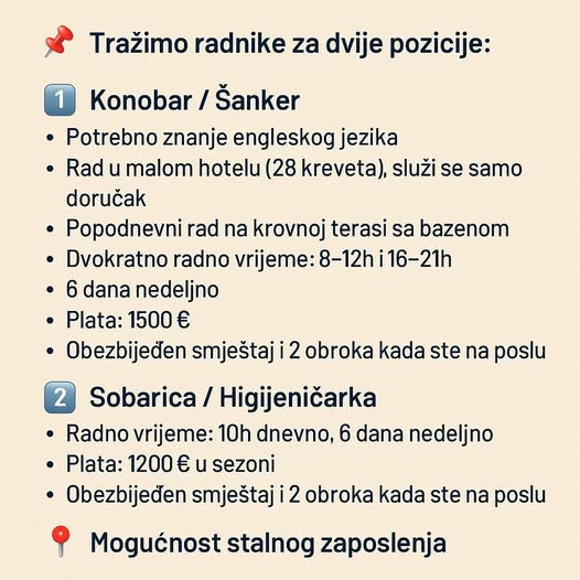 Radno vrijeme: 10h dnevno, 6 dana nedeljno • Plata: 1200 € u sezoni