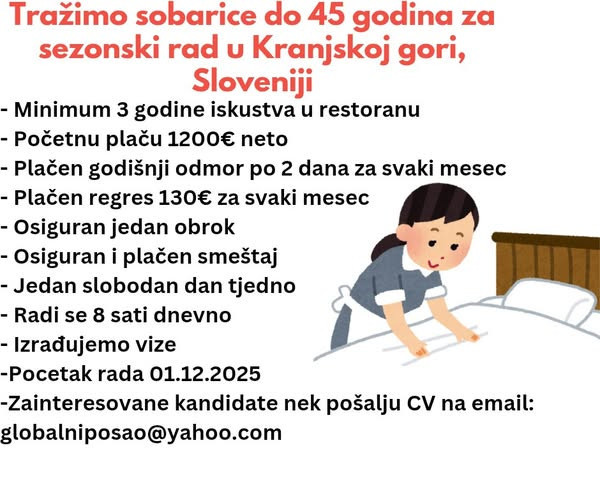Tražimo sobarice do 45 godina za sezonski rad u Kranjskoj gori, Sloveniji