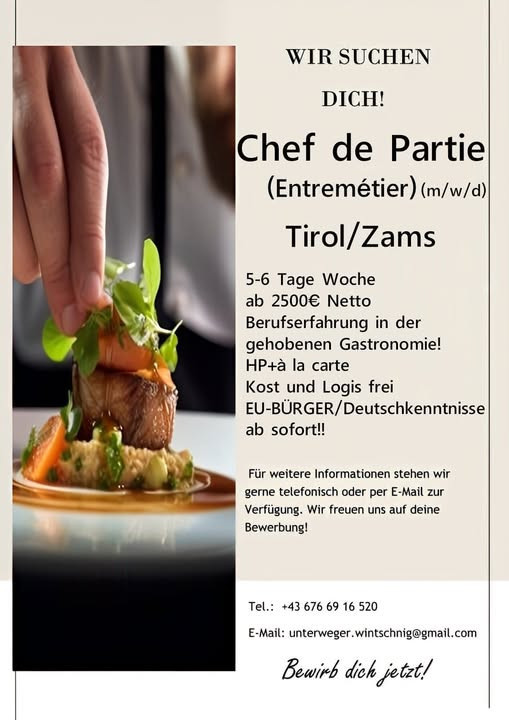Stellenausschreibung: Chef de Partie – Entremetier (m/w/d) | Tirol ![]()